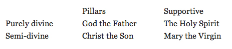 A trinitarian version is clear in Matthew 28:19, baptized “in the name of the Father, the Son and the Holy Spirit”, three faces of one God. The Father and his emanation, the Holy Spirit, are the church pillars, the Holy Spirit received by the believers, starting with the popes. Headed by the Pope, a curia of learned interpreters, the congregation.