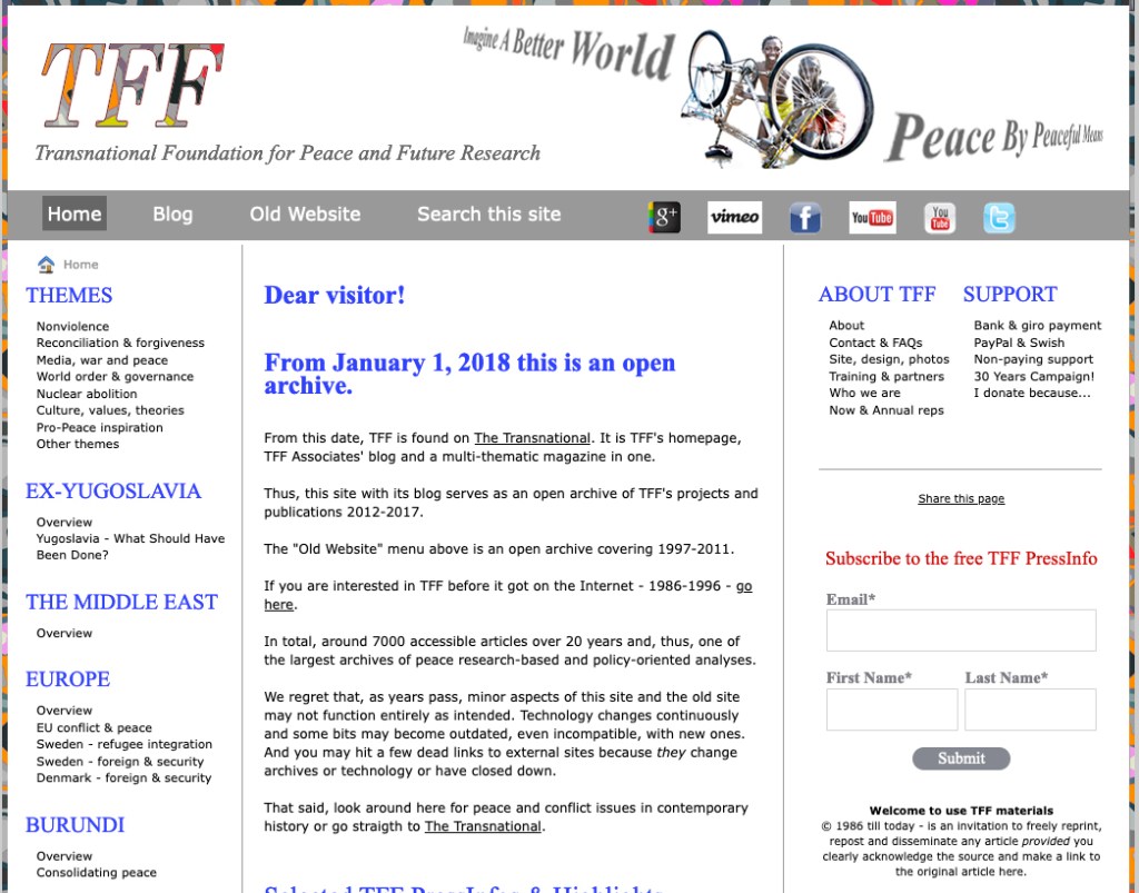 In addition to what you find here and on the older as well as the present TFF home, there are articles, videos, analyses etc that we continue to publish elsewhere – namely on TFF Facebook and Jan Oberg Public Figure profile, on Jan Oberg Facebook profile, on the online magazine “Transnational Affairs”, on TFF YouTube (now also an archive), on TFF Vimeo and – closely related – on Jan Oberg’s blog. Our Twitter basically carries the same materials as Facebook.